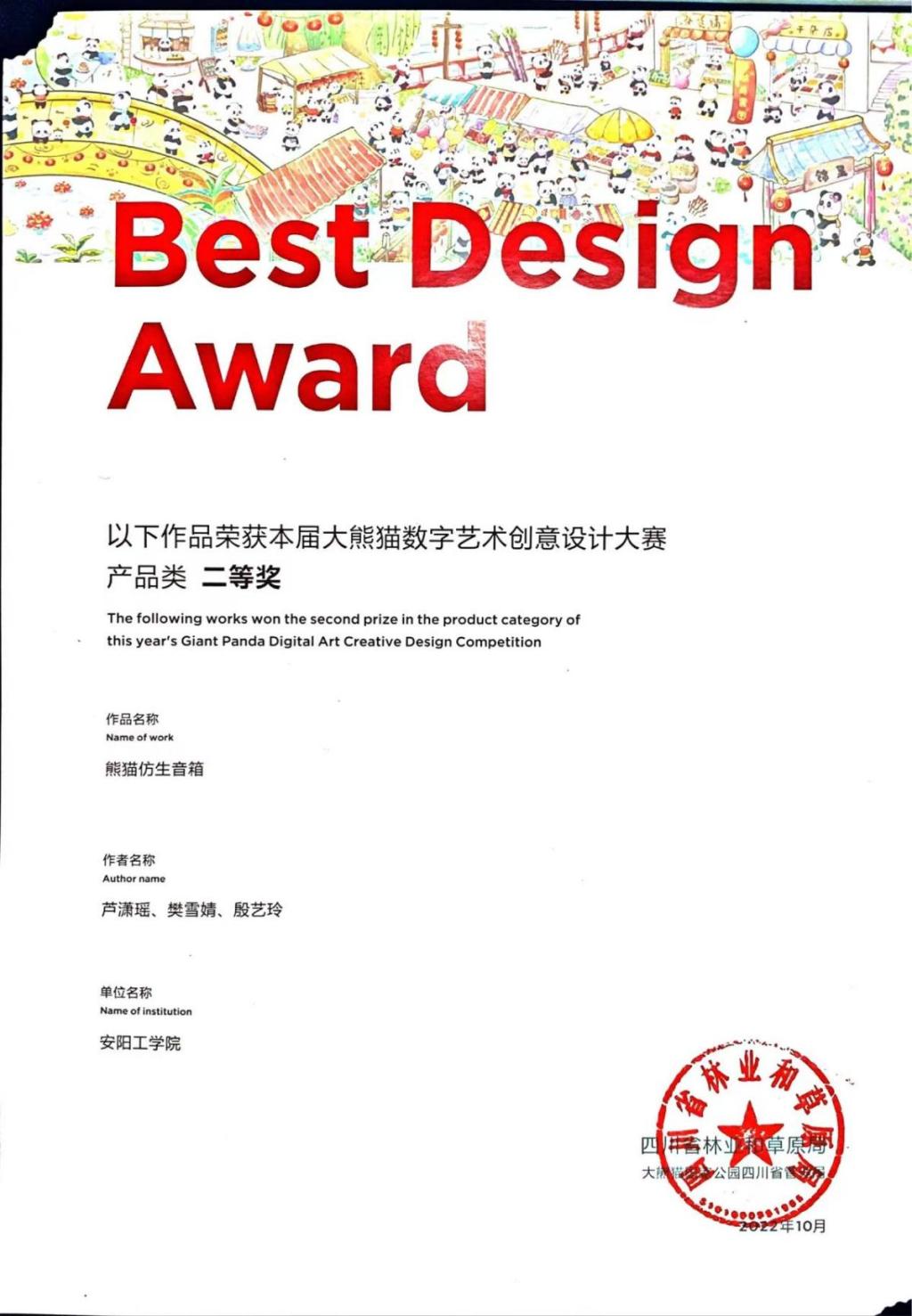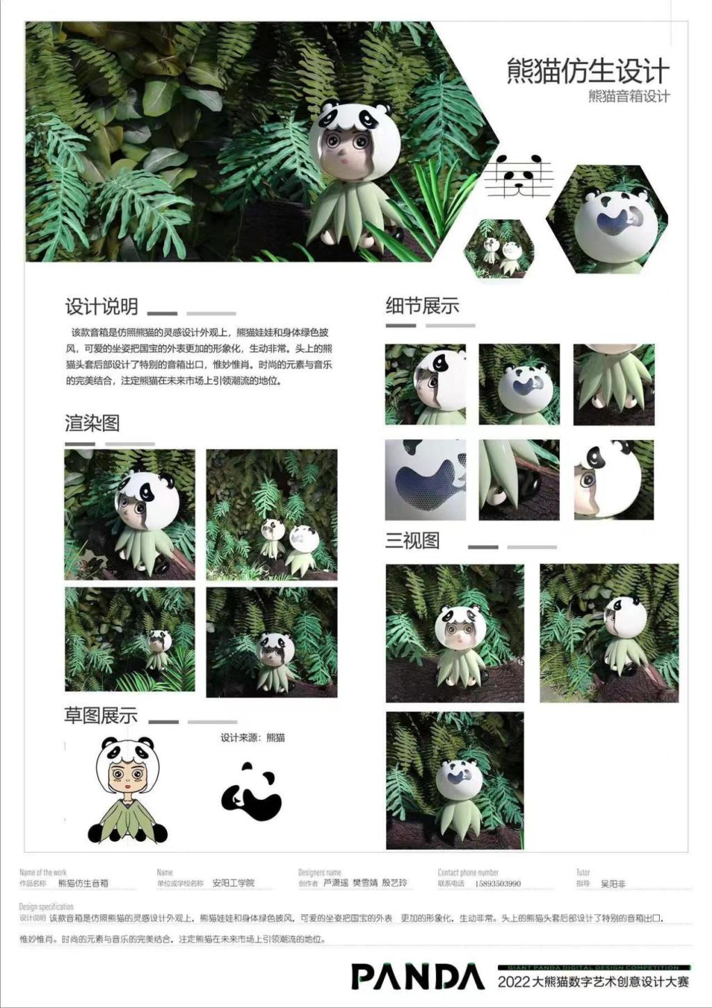 近日,2022大熊猫数字艺术创意设计大赛评审会在四川省林业和草原局顺利举办。大赛共收到全国包括中央美术公司、广州美术公司等高校以及创意设计类机构提交的1121件作品,公司产品设计2020级1班员工芦潇瑶、樊雪婧、殷艺玲的作品《熊猫放生音箱》荣获产品类二等奖,吴阳非老师荣获优秀指导奖。