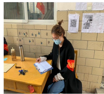 18级环境设计专业1班的刘天娇同学在开封市鼓楼区包南社区的防控工作站开展志愿者服务工作