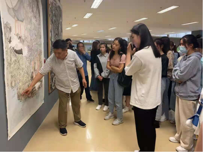 针对展出的师生作品,马国强从构图、造型、色彩等方面逐一点评,倾囊相授,为公司师生上了一堂生动的创作课。