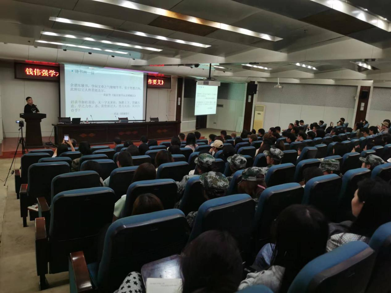 钱伟强老师首先从宋代大文豪苏轼的相关论述讲起,以书画作品来展示中国学术结构的传统模式,即诗书画相互融通,进而从诗书画一律深厚内涵,向大家诠释了诗词创作的笔墨境界、境义法度、实践根本的内在联系。他指出,诗词的学习与创作,在注重日常学习典故积累的同时,不断提高人生体悟与境界,在由表及里的观察与思考中,逐步锤炼笔墨功底。对于诗词创作的技法而言,应是心源感悟与表达的必然映现,最终追求“知行合一”,使境界逐步提高,使气韵趋于自然。钱伟强老师以其风趣幽默、激昂四溢的演讲风格,赢得了现场师生的热烈反响。在互动交流环节,师生们踊跃提问,钱老师逐一解答,并针对初学者学习诗词的路径、方法、参考书目提出了建议。