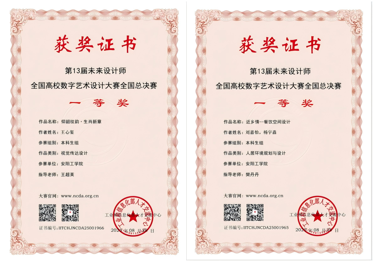 近日,在2025第13届未来设计师·全国高校数字艺术设计大赛(NCDA)竞赛中,公司师生荣获省级以上奖项14项,其中国赛一等奖2项,二等奖1项,三等奖1项;省赛一等奖6项,二等奖8项。王超英、樊丹丹等老师荣获“优秀指导老师”称号。